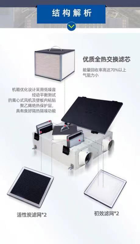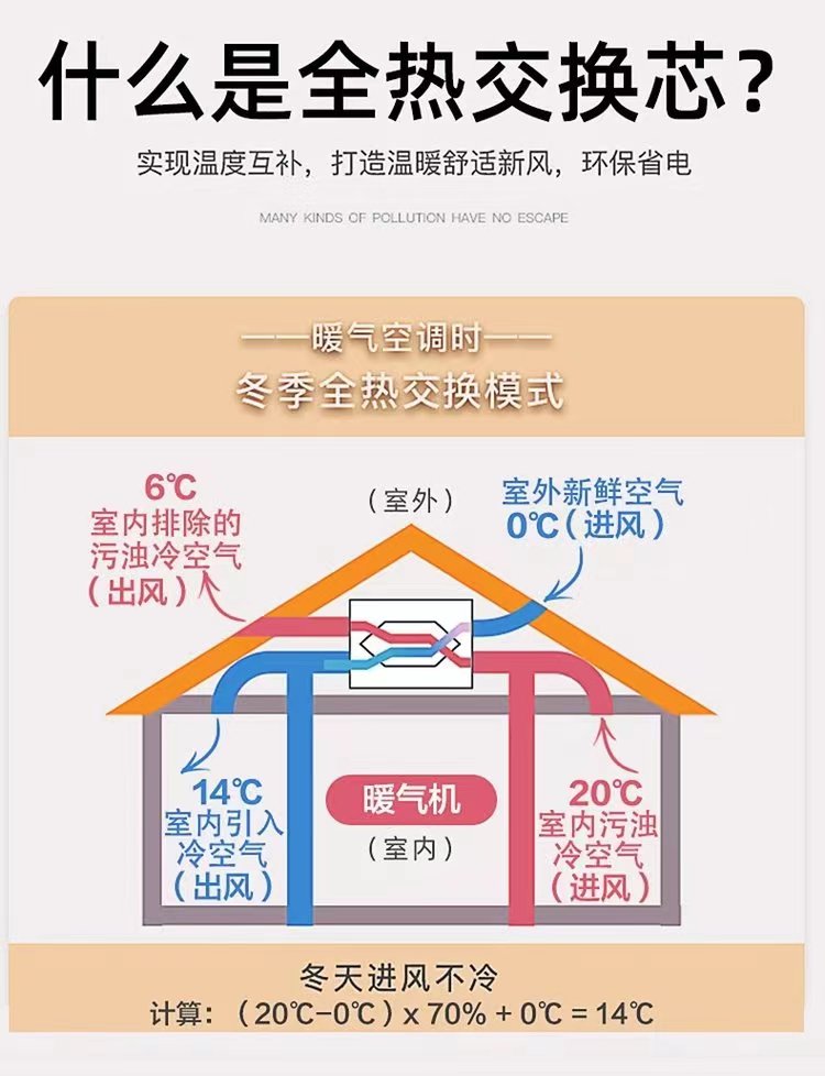 那在冬季的時候呢,還可以利用室內(nèi)暖氣的能量,對室外的冷空氣進行預熱,再送回室內(nèi),這樣室內(nèi)的暖氣的能量損失減少,并且可以給進入室內(nèi)的新風加濕,因此無論是夏季還是冬季進入室內(nèi)的新風都可以通過全熱交換芯體,從排出去的空氣中回收能量,從而降低能耗,節(jié)約能源,達到健康舒適環(huán)保的目的,另外全熱交換效率越高,交換時損失的能量也就越少,也會更加的節(jié)能。