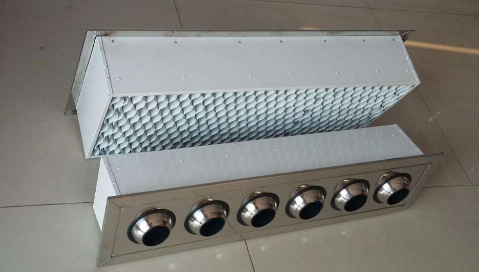 射流消聲風(fēng)口是指將射流部件,即具有消聲功能的射流部件消聲體,按照一定的間距和排數(shù)安裝在矩形(或狹縫形)和圓形殼體內(nèi),形成矩形和圓形消聲風(fēng)口?;蛘邔⑸淞鹘M件消音體和照明燈組合在一起,形成集供氣、消音和照明三大功能于一體的燈式消音風(fēng)口。它由中國兵器工業(yè)第205研究所開發(fā),并獲得國家專利。