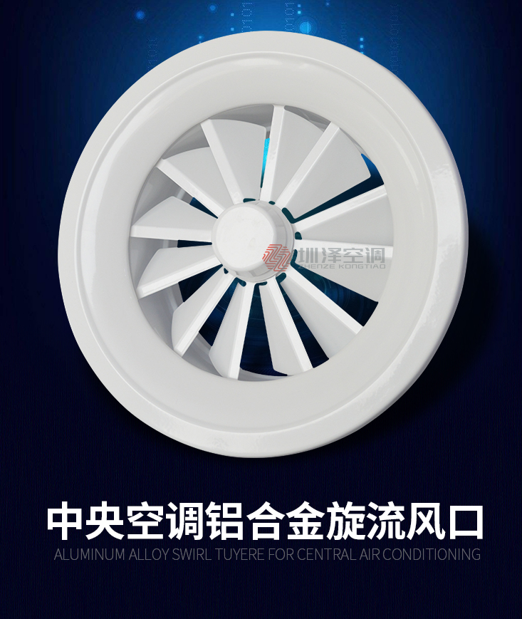 旋流風(fēng)口是空調(diào)系統(tǒng)中的一個(gè)送風(fēng)工具。在空調(diào)通風(fēng)系統(tǒng)中可用作大風(fēng)量,大溫差送風(fēng)以減少風(fēng)口數(shù)量,安裝在天花板或頂棚上,可用于3米以內(nèi)低空間,也可用二種高度大面積送風(fēng),高度甚至可達(dá)10米以上。